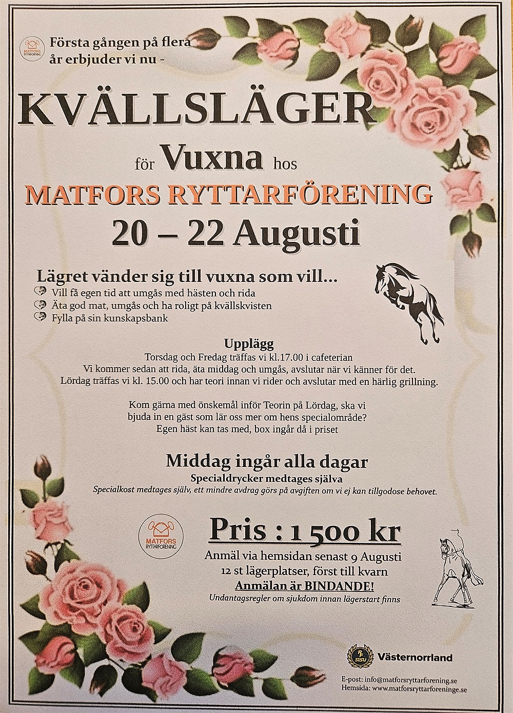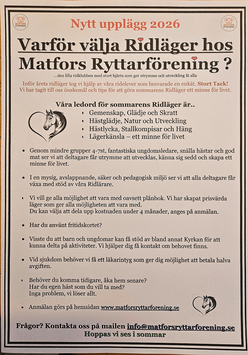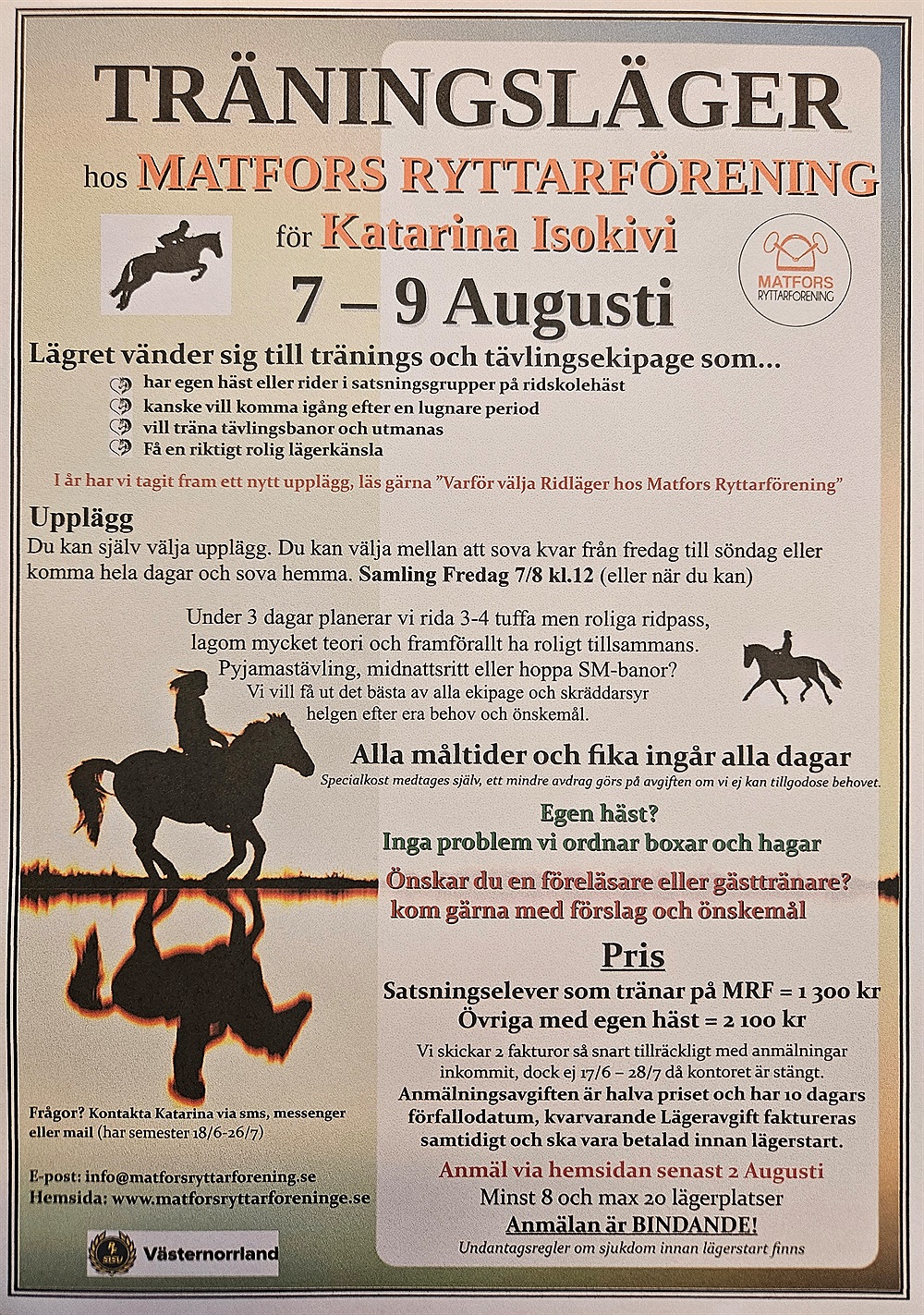 Anmälan till ridläger görs på hemsidan, frågor skickas till info@matforsryttarforening.se