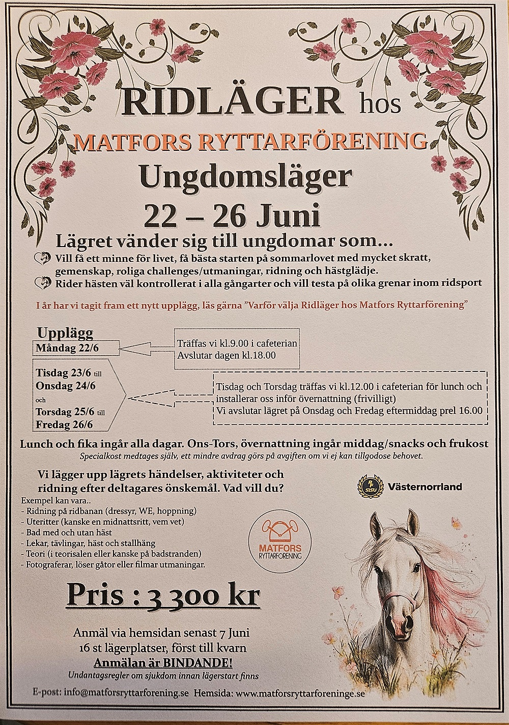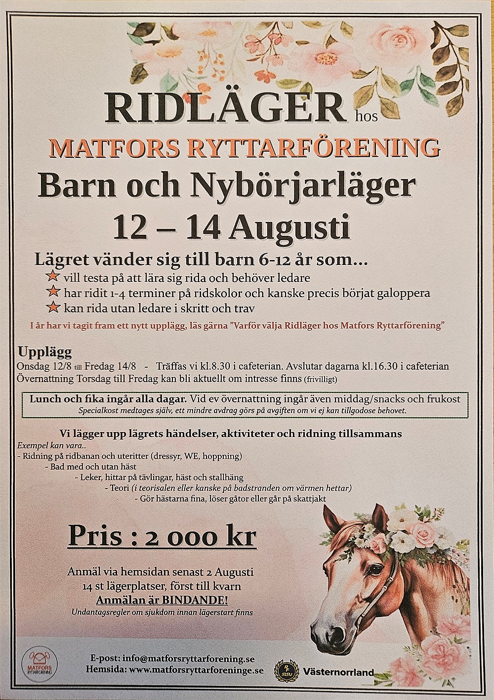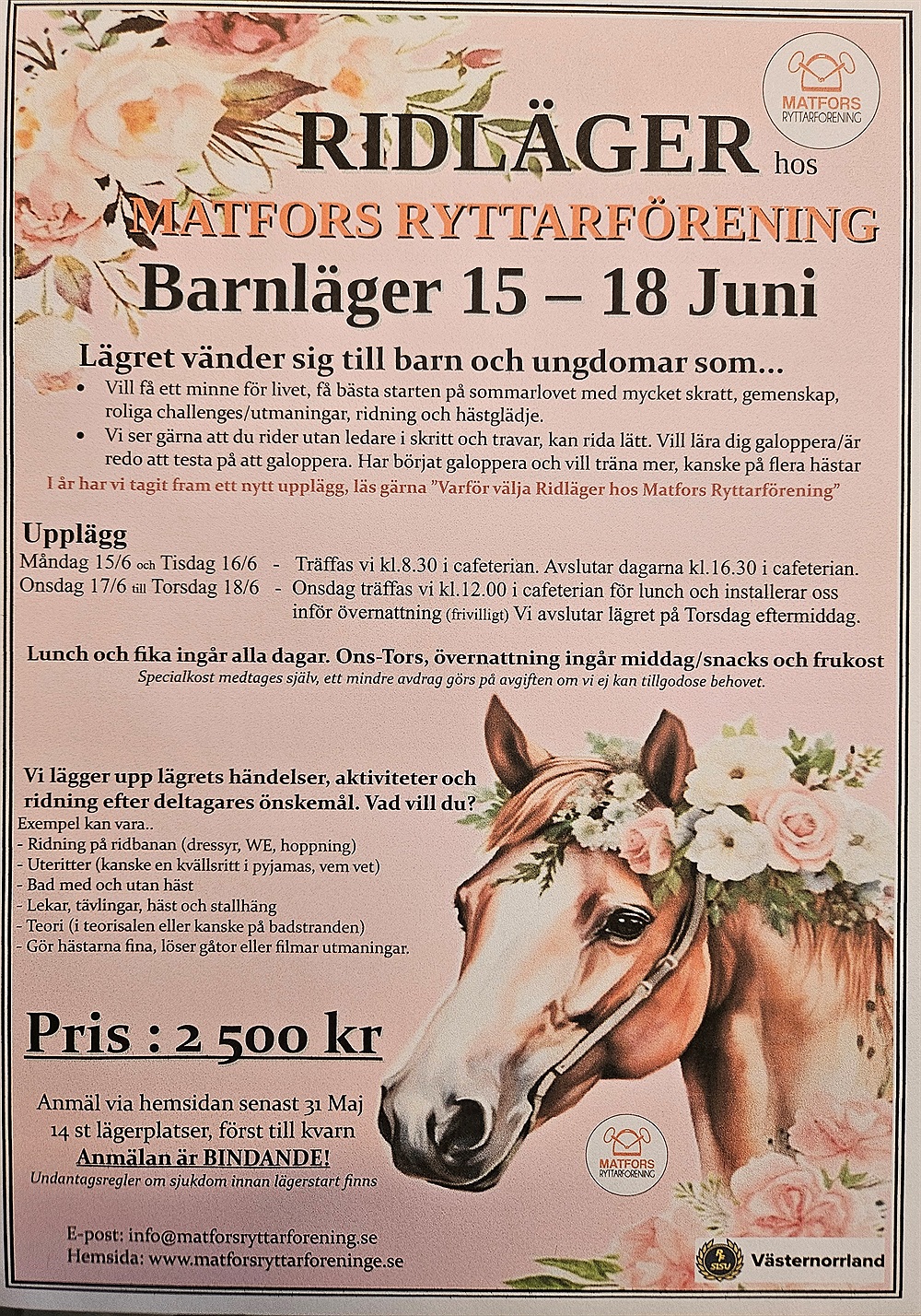Anmälan till ridläger görs på hemsidan, frågor skickas till info@matforsryttarforening.se